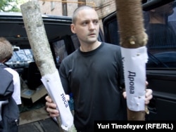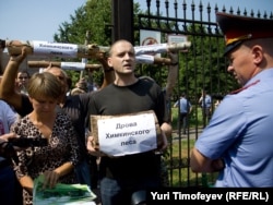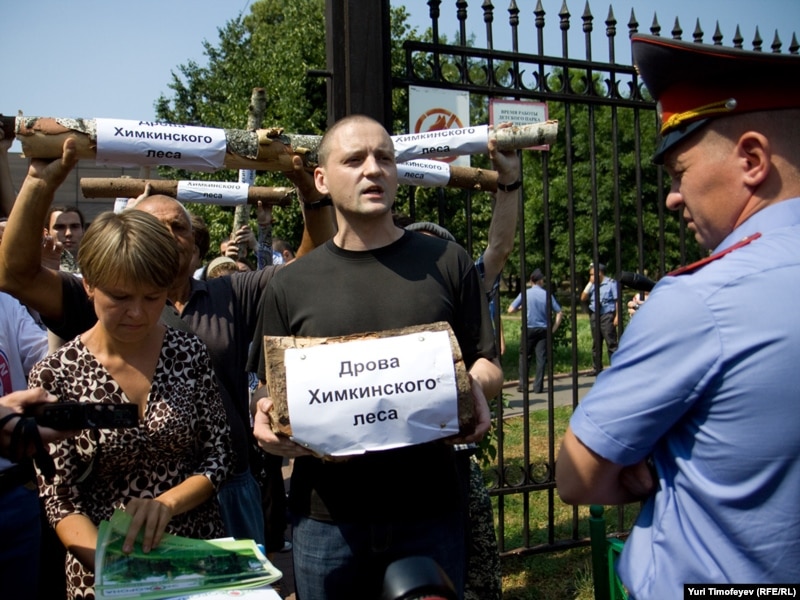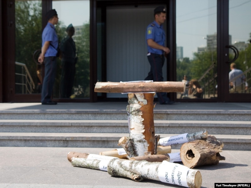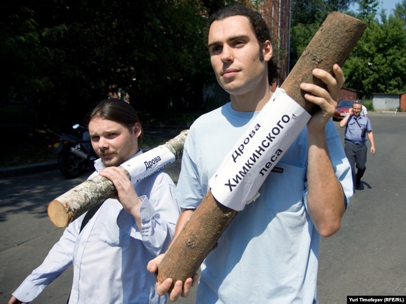 Защитники Химкинского леса и представители "Левого фронта" провели акцию у Белого дома. Евгения Чирикова и ее товарищи привезли с собой уничтоженные вырубщиками деревья - к бревнам прикреплены листки с надписями "дрова из Химкинского леса". Активисты собирали подписи под обращением к правительству России с требованием прекратить вырубку. Акция была пресечена милицией.