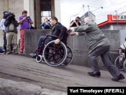 Вторая неудача постигла столицу метров через двести, у входа на станцию метро "Боровицкая". Никто из колясочников приблизиться к нему не пожелал и здоровым коллегам не рекомендовали: "Дверью убьет".