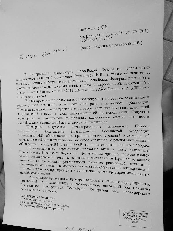 "Средства, которые я заработал, будучи предпринимателем, и которые находятся сейчас в доверительном управлении, являются основой моей независимости от различных групп влияния при принятии мной служебных решений", - объяснил сам Игорь Шувалов журналистам 28 марта. В свою очередь, представитель секретариата первого вице-премьера в тот же день сообщил: "…Это подтверждает и проведенная проверка Генпрокуратуры России в отношении соответствующих утверждений в публикациях... Она подтверждает, что Игорь Шувалов не допускал в своей деятельности нарушений законодательства или конфликтт интересов" (цитата по РИА Новости, 28 марта 2012 года). Примечательно, что представитель Шувалова отчитался о результатах проверки Генпрокуратуры еще до ее официального завершения (ответ, который Наталья Пелевина лично получила в Генпрокуратуре 6 апреля, датирован 29 марта 2012 года).