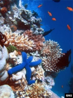 Голубая морская звезда отдыхает на кораллах. Австралия. Большой Барьерный риф. Понтоны предполагается расположить в самых уязвимых для воздействия высокой температуры местах Большого Барьерного рифа. В ходе предварительного испытания ученые убедились, что явление «выбеливания» коралловых рифов, свидетельствующее о скорой гибели коралловых колоний, напрямую зависит от интенсивности солнечного света. Ткань отражает свет, понижая температуру морской воды, и преграждая путь вредоносному ультрафиолетовому излучению.