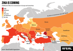 В докладе Всемирной Организации Здравоохранения (ВОЗ) от 18 июня говорится, что отныне в зону высокого риска заражения вирусом Зика входят, например, все российское побережье Черного моря в Краснодарском крае и побережье Грузии (включая Абхазию), а также португальский остров Мадейра в Атлантике, в зону умеренного риска – прибрежные области большинства государств Балканского полуострова и Турции. Это связано с тем, что комары рода Aedes, переносящие вирус, исторически являются коренными обитателями указанных земель. Всего в списке 18 европейских государств, подчеркивает Жужанна Якаб, директор Европейского регионального бюро ВОЗ: