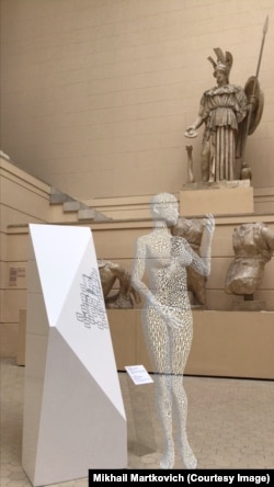 А.Б.: 20 июня открылась наша персональная выставка в музее имени Пушкина в Москве Homo Virtualis. В ней мы тоже используем приложение и различные виртуальные объекты. Работы все новые, за исключением нескольких вещей из прошлой нашей венецианской выставки 2015 года Conversion, в которой сравнивалось подключение к Глобальной сети с обрядом обращения в религию, где главное божество – сумма всей информации, находящейся в виртуальном пространстве. В Пушкинском музее мы спровоцировали интервенцию в постоянную коллекцию музея, поместив наши скульптуры в контекст классических музейных объектов. Нам интересно изучить эти диалоги, понять взаимодействие классики и не-классики. Ход это достаточно старый, но каждый раз он работает по-новому в зависимости от того, что именно ты туда помещаешь. А осенью планируем делать проект для Московской международной биеннале. Кроме того, у нас в планах Лионская биеннале, выставка во Франции в регионе Атэш, несколько мероприятий в Лондоне и выставка в Москве на Винзаводе.