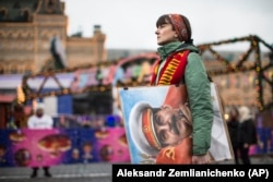 Художница с портретом Иосифа Сталина на украшенной перед Новым годом Красной площади Москвы – 21 декабря, когда сторонники советского диктатора отмечали его день рождения. По опросу "Левада-центра", проведенному в середине 2017 года, 38 процентов россиян считали Сталина самым выдающимся человеком всех времен и народов. Владимир Путин и Александр Пушкин разделили второе место (34%), далее следовали Владимир Ленин (32%) и Петр Первый (29%).
