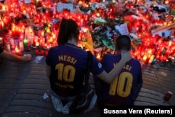 Импровизированный мемориал на месте террористического нападения в Барселоне, 20 августа. Тремя днями раньше в центре каталонской столицы группа молодых людей, связанных с исламскими террористическими организациями, совершила два террористических нападения на прохожих. Погибли 16 человек, более 130 были ранены. Полиция застрелила нападавших.