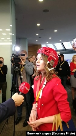 А вот представительница первоуральской прессы, она собирается задать вопрос о хоккее с мячом