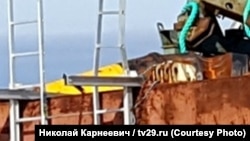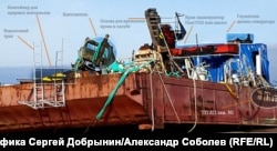 Радио Свобода удалось установить марку этого крана-манипулятора: судя по различимым на фотографии элементам, это КМУ итальянской фирмы Fassi, которая производит широкую номенклатуру популярных в России коммерческих подъемных устройств, в том числе в морском исполнении – для установки на палубу судна. Представитель российского дилера Fassi, которому Радио Свобода направило фрагмент снимка, предположил, что это модель из ряда F85-F125, грузоподъемностью (при минимальном вылете стрелы) от 4,5 до 5,5 тонн. Впрочем, в ассортименте Fassi есть модели и более высокой грузоподъемности.
