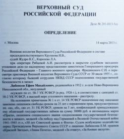 В биографической справке героя новой публикаци, Ефима Либенсона, вместо даты смерти придется поставить прочерк. Мы не знаем, где и как умер бывший полковник госбезопасности после того, как вышел из советского лагеря в 1968 году – личные дела чекистов хранятся за семью печатями в архивах ФСБ. Однако о том, как он жил, мы узнаём из его биографии, а также документов, связанных с его служебной деятельностью и осуждением. Например, из проекта обвинительного заключения по уголовному делу Либенсона за подписью и. о. генерального прокурора СССР Баранова становится известно о садистских наклонностях чекиста. Полный текст документа доступен в интернете. Еще одним важным документом является определение Верховного суда РФ от 14 марта 2013 года. Суд изменил статьи Уголовного кодекса, по которым Либенсон был привлечен к ответственности, с политических на общеуголовную. Российский суд также оставил прежнюю меру наказания в виде лишения свободы, но исключил из приговора указание о конфискации имущества. Такое решение было принято потому, что "Либенсон совершил не контрреволюционные преступления, а злоупотребление властью и превышение власти при наличии особо отягчающих обстоятельств".