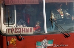 На этом фото 28 или 29 сентября ингушско-чеченская граница, когда начались первые авианалеты на Чеченскую республику, поток беженцев в Ингушетию, и вот эти люди прекрасные, в этой замечательной форме, это какое-то спецподразделение ингушского МВД, которое бросили на усиление границы, на досмотр транспорта, на досмотр людей, на то, чтобы не проникало оружие в лагеря беженцев через границу, ну, и так далее, на обеспечение безопасности. И вот у него такой орлиный, соколиный, совершенно прекрасный взгляд, он привлек меня через колючую проволоку, и я сделал такую фотографию. Ну, и соответственно, дальше уже кто на чем выбирался. Чеченские семьи… Наши бойцы, останавливающие автобусы… Этот замечательный совершенно ребенок, девочка, в автобусе с надписью "Грозный", который едет, наоборот, из Грозного, а не в него. Этот чеченский волк, который какое-то время был символом республики. Самое начало второй чеченской кампании.