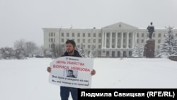 В Пскове активист Александр Максимов вышел с одиночным пикетом в центр Пскова. Он стоял с плакатом "День убийства Бориса Немцова. Эти пули в каждого из нас. Мы все помним и не простим".