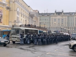 Корреспондент РС сообщает, что Манежная площадь перекрыта и оцеплена. В проезде у Большого театра стоят автозаки и построенная колонна из десятков силовиков