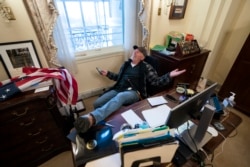 Еще один сторонник QAnon – человек, который позировал в кресле спикера Палаты представителей Нэнси Пелоси в ее кабинете. Он положил ноги на стол законодателя и развалился в ее кресле: