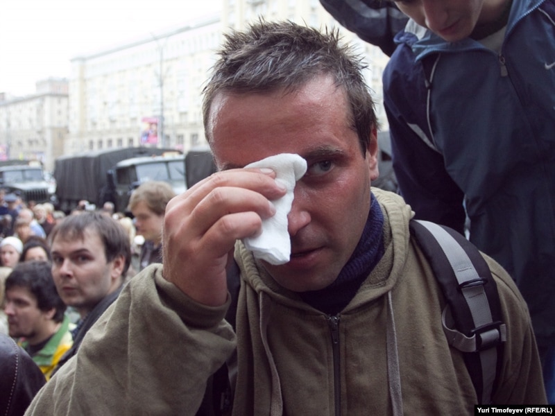 Главный редактор радиостанции "Эхо Москвы" Алексей Венедиктов объясняет милиционеру, что он просто стоит
